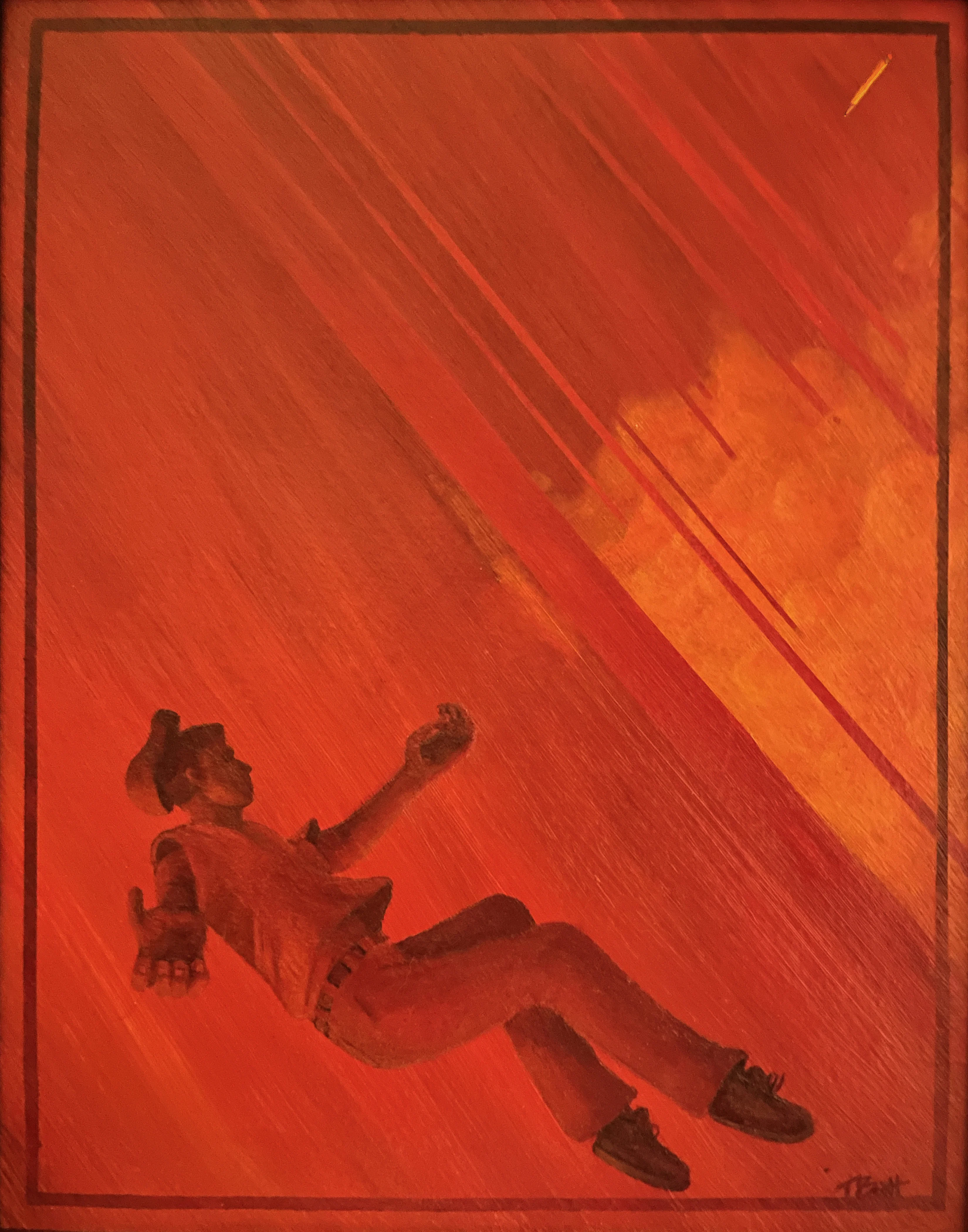 "Falling" - An acrylic painting of a person falling backwards through the sky and clouds reaching out toward a falling pencil. - painted by Tim Scott.