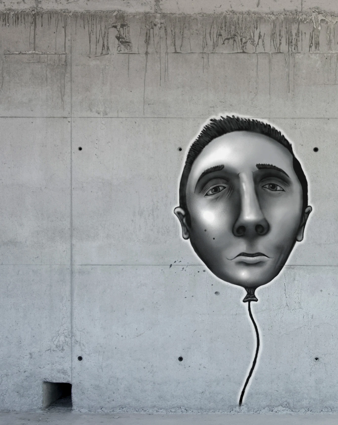 "Lead Balloon" - A hand-painted picture on a wall of a character's head ballooned out without a body, tethered by a dangling string as it struggles to lift under its own weight. - painted by Tim Scott.