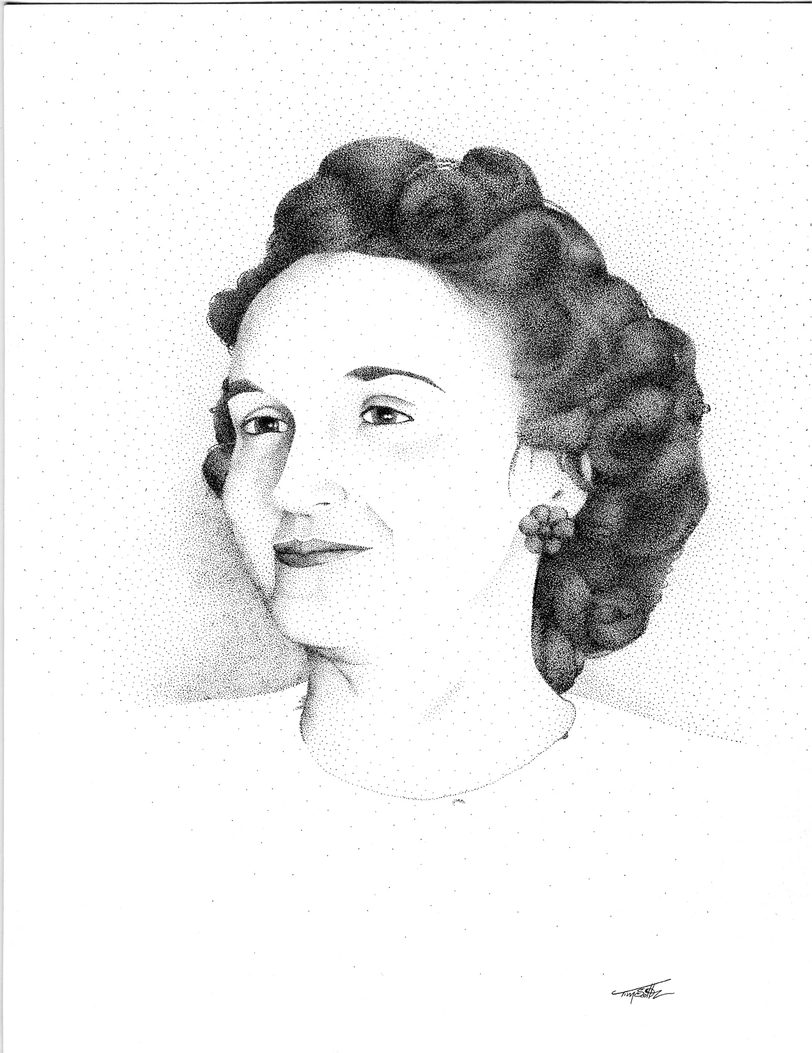 "Millie Scott" - A detailed black and white pen-and-ink pointillism portrait of a smiling woman, focusing on her head and facial features, drawn by Tim Scott.