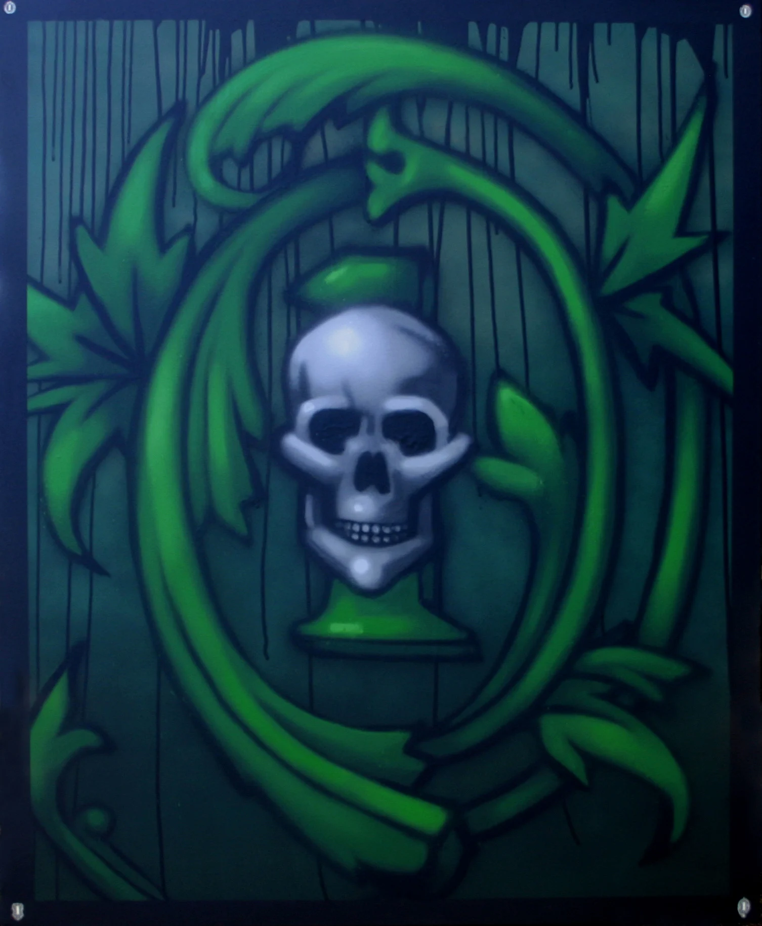 "Money and Mortality" 4ft x 5ft canvas. A spray-painted canvas depicting ornate leaves and vines encircling the number 1 in green, resembling the corner of a one-dollar bill. The piece features a dark green, dripping background with a human skull floating in the foreground. - painted by Tim Scott.