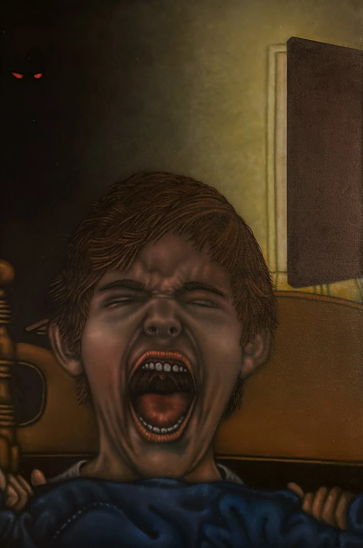 "Nightmare" An airbrushed painting on canvas of a young boy awoken by a nightmare, sitting up in bed in a dark room, with light pouring in from a cracked-open door behind him - while glowing red eyes hover in the shadows of the far corner - painted by Tim Scott.