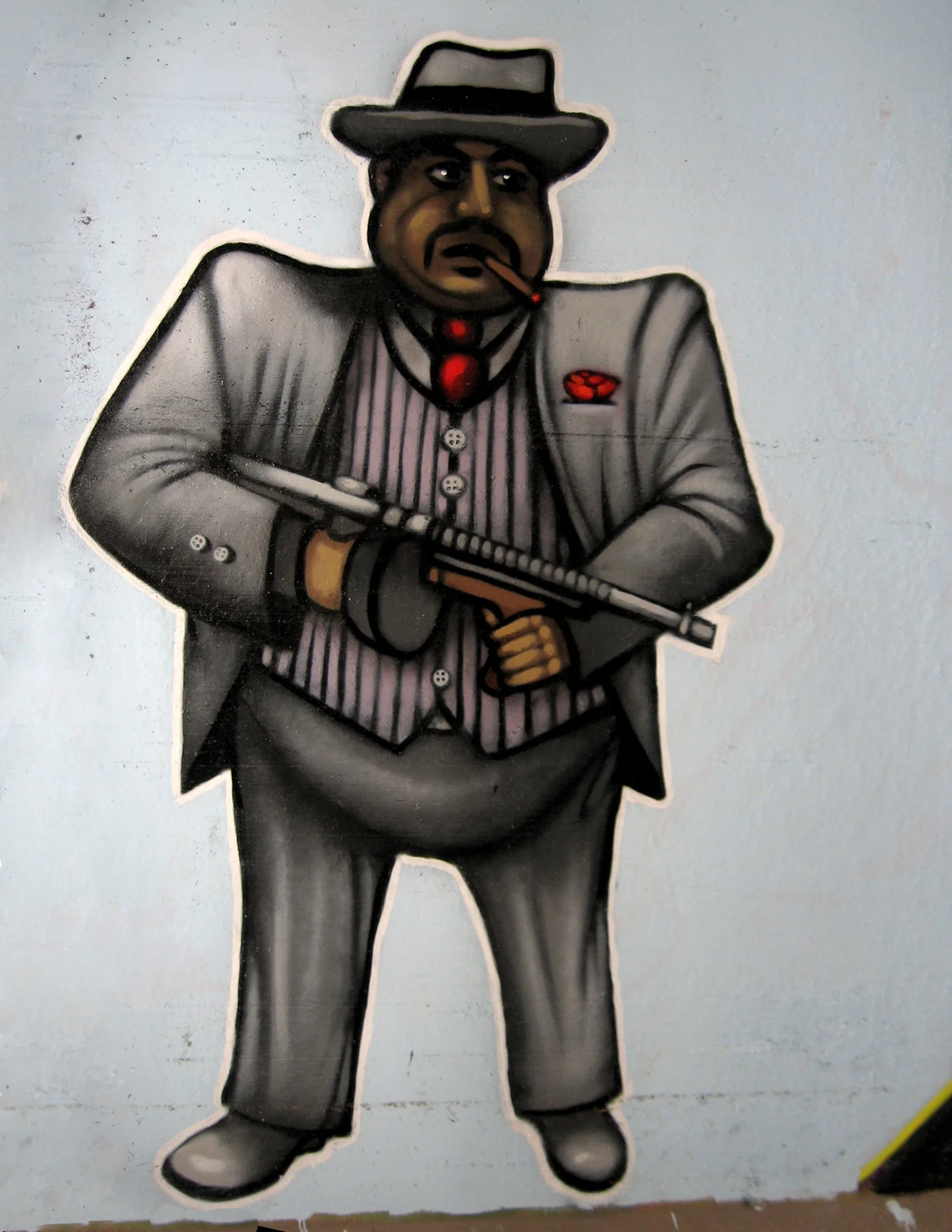 Mural of a mafia character in a pin striped vest and Tommy gun painted in Austin TX - Original Art by Tim Scott