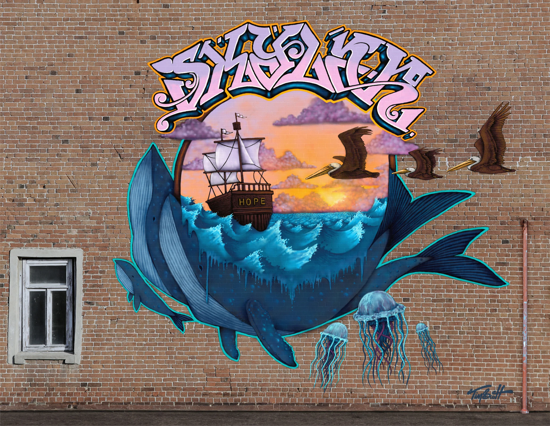 "Skylar Hope Sunrise" A hand-painted picture of a sailing ship at sea during a vibrant sunrise, as whales, jellyfish, and seagulls - each with their young - engage with the new day - painted by Tim Scott.