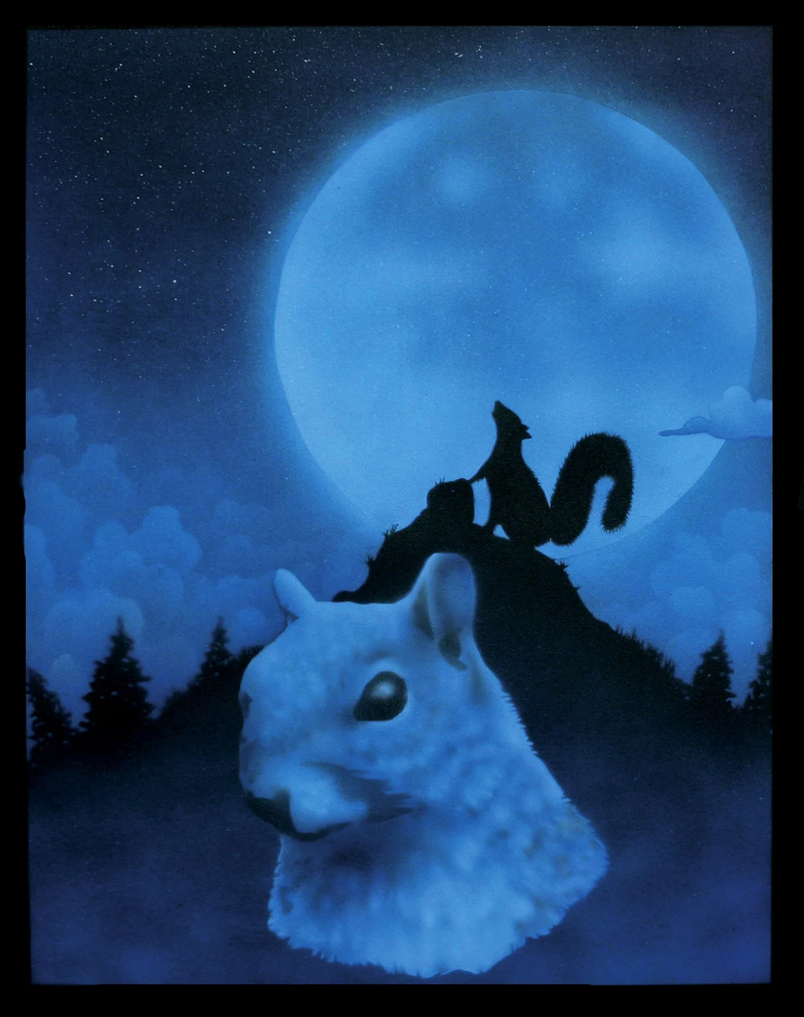 "Squirrel Moon" - A hand-painted, airbrushed canvas depicting a squirrel bust rising from the clouds, while another squirrel in the background is perched on top of a hill, howling at the full moon. - painted by Tim Scott. Was used as an ACL Music Festival T-shirt