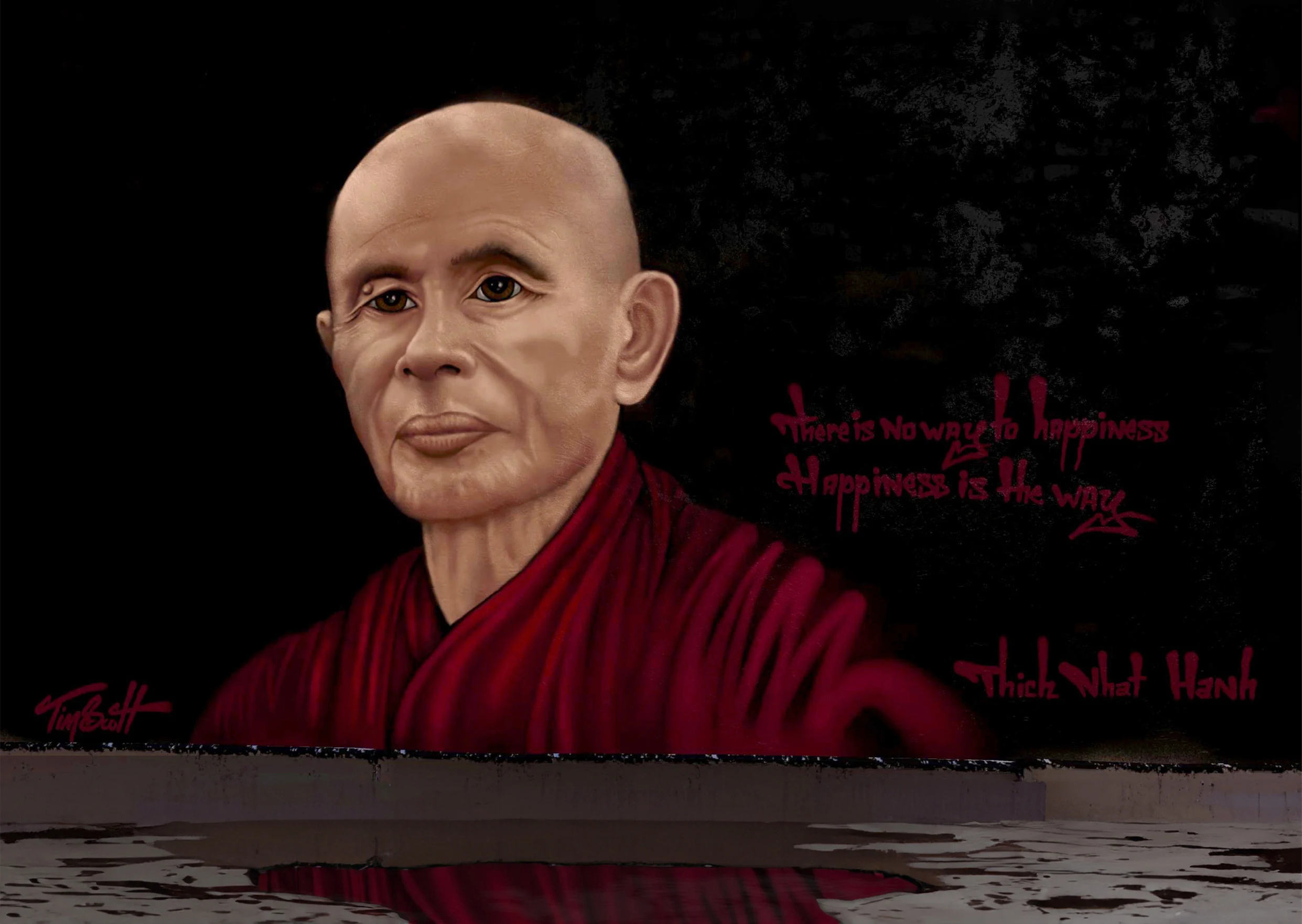 "Thich Nhat Hanh" A hand-painted mural featuring a portrait of Thich Nhat Hanh as an homage, accompanied by his quote: "There is no way to happiness, happiness is the way." - painted by Tim Scott.