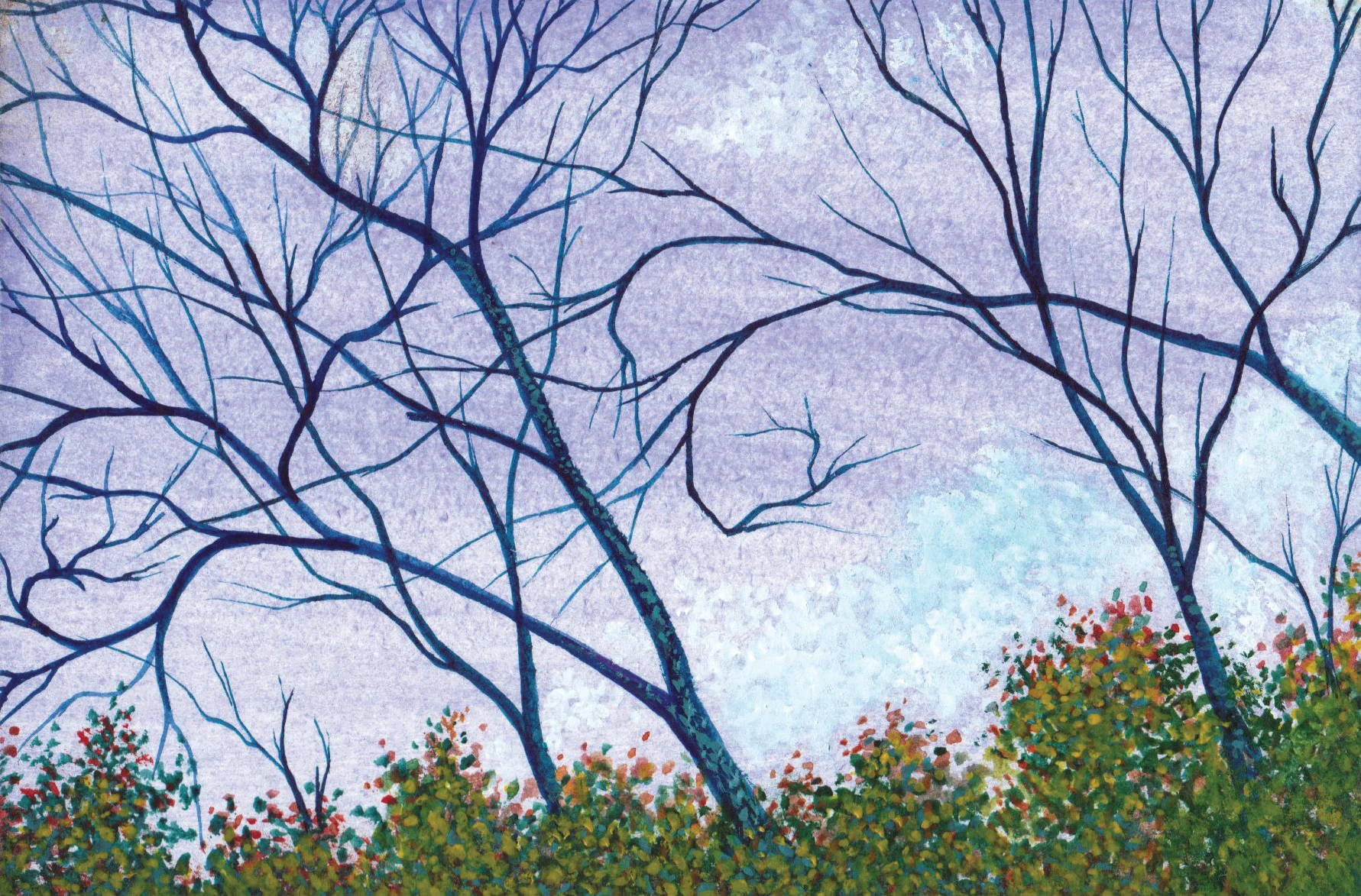 "Winter Chill" - A hand-painted watercolor on paper, depicting a winter scene of bare tree branches reaching toward the sky above shrubs and brush. - painted by Tim Scott.
